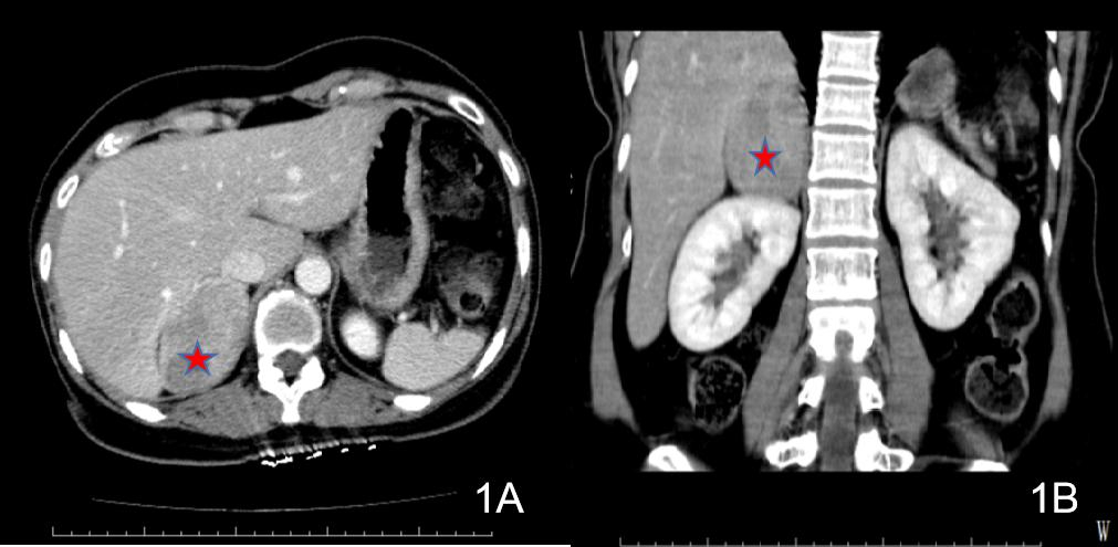 | 图 1 2017-11-20患者1腹部CT(右侧肾上腺区肿块) |