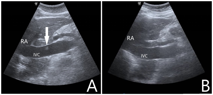 | A:箭头显示超声下在下腔静脉处附壁漂浮的血栓;B:经治疗后超声在下腔静脉未见明显异常回声;RA:右心房,IVC:下腔静脉 图 1 撤离ECMO 1 d后行下腔静脉超声检查 |