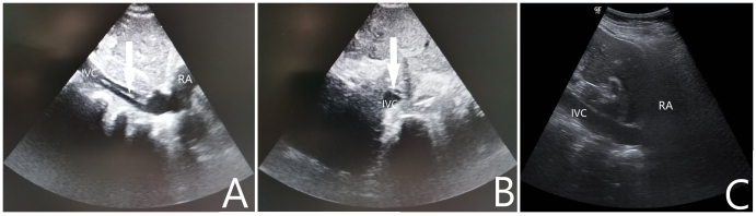 病例2:女性,69岁,农民,既往有“高血压病”“脑梗塞”“痛风”史,长期服用氨氯地平片及氯吡格雷片。主诉“胸闷胸痛2 h”于2021-10-27入院。入急诊查心电图提示存在“高侧壁、前臂、前侧壁ST段弓背向上抬高”,在送往介入室的途中出现意识不清,大动脉搏动消失,予以胸外按压、气管插管等高级生命支持。复苏期间心电监护提示室速、室颤,予以多次电除颤无法维持ROSC,征得家属同意后行ECMO支持,ECMO参数设定:转速3 400 r/min,流速3.5 L/min,吸入氧浓度100%,气流量4 L/min,成功转机后停止胸外按压,患者出现ROSC,复查床旁心电图提示“高侧壁、前臂、前侧壁ST段较前抬高”。患者出现ROSC后转运至介入室行经皮冠脉造影提示左前降支近中段次全闭,予行冠状动脉造影术+ 冠状动脉成形术+ 药物洗脱冠状动脉支架植入术+ 主动脉球囊反博泵置入,术前ECMO上机后使用肝素4 500 U,入导管室测ACT 185 s,术中追加肝素1 000 U。返回急诊ICU后给予全身肝素化抗凝,每2 h监测一次APTT,目标APTT维持在60~80 s。入院当天查心脏彩超提示LVEF:20%,左室壁运动明显减弱;入院后第1天患者口鼻腔、穿刺处大量渗血及皮下血肿,血红蛋白进行性下降,给予输红细胞悬液6 U、新鲜冰冻血浆1 000 mL并调整肝素抗凝强度使得APTT维持在50~60 s。入院后第4天复查心脏彩超提示LVEF:55%,心肌活动较前好转,并已脱离血管活性药物,遂撤除ECMO,撤机前ECMO参数设定:转速2 300 r/min,流速2.0 L/min,吸入氧浓度50%,气流量3 L/min。在拔除ECMO导管后即刻行超声筛查发现下腔静脉至右心房入口有血栓形成,长约7.2 cm,宽0.4 cm,随血流飘动(如图 2A、2B所示),筛查下肢其他部位未见明显血栓形成,遂给予依诺肝素钠100 IU/kg皮下注射每12 h一次治疗。入院后第5天行超声检查下腔静脉未见明显异常回声(如图 2C所示)。住院期间患者未出现过下腔静脉综合征或肺栓塞的症状或体征。入院后第8天患者转心内科病房,康复后出院随访1个月未遗留任何中枢神经系统并发症。