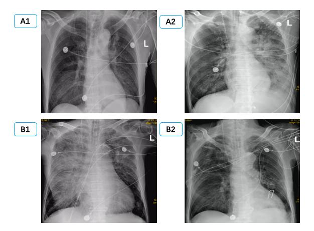 | (A1、A2为同一患者,左侧PE,男,65岁,A1为发病前,A2为心脏骤停4 h后。B1、B2为同一患者,右侧PE,男,68岁,B1为心脏骤停后4 h后,B2为治疗3 d后。) 图 1 单侧肺水肿胸片表现 Fig 1 Manifestations of unilateral PE on X-ray |