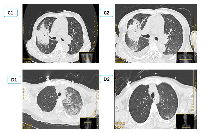 | (C1、C2为同一患者,右侧PE,男,56岁,冠状动脉搭桥术后,C1为咳嗽咳痰1周入院时,C2为抗感染治疗14 d后。D1、D2为同一患者,左侧PE,女,32岁,眼眶下局麻后心脏骤停,D1为心脏骤停后3 h,D2为心脏骤停后24 h。) 图 2 单侧肺水肿CT表现 Fig 2 Manifestations of unilateral PE on CT |