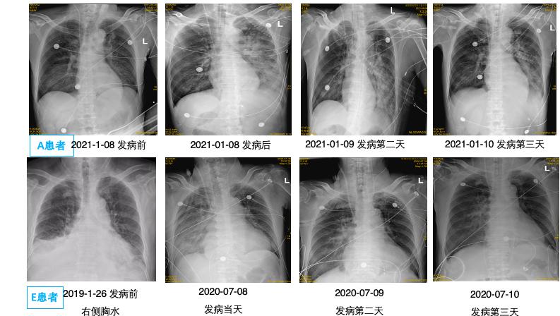 | 图 4 患者B胸片及肺部超声改变过程 Fig 4 X-ray and lung ultrasound image of patient B |