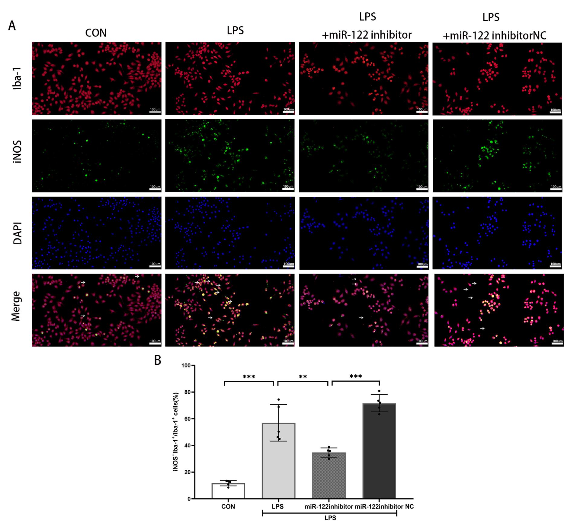 细胞实验分组:对照组(CON组)、脂多糖组(LPS组)、脂多糖+miR-122-5p抑制剂组(LPS+ miR-122 inhibitor组)、脂多糖+miR-122-5p抑制剂阴性对照组(LPS+miR-122 inhibitor NC组)。