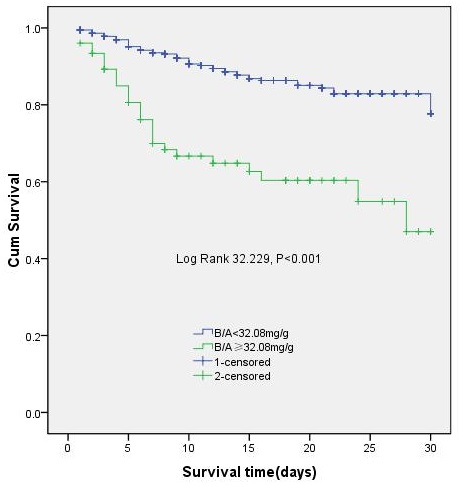 | 图 1 B/A≥32.08 mg/g者与B/A<32.08 mg/g者30 d生存率比较 Fig 1 omparison of 30-day survival rate between groups with B/A≥32.08 mg/g and B/A < 32.08 mg/g |