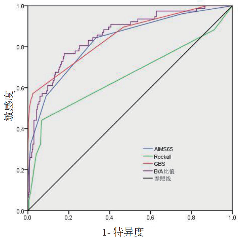 B/A比值、GBS、Rockall和AIMS65评分预测30天死亡的曲线下面积(AUC)分别为0.855(95%CI 0.807~0.902)、0.849(95%CI 0.796~0.901)、0.657(95%CI 0.576~0.737)、0.828(95%CI 0.774~0.883)(具体见图 2)。