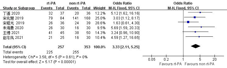 共纳入6项研究,包括610例患者。Meta分析显示,静脉溶栓组90 d改良mRS评分[OR =3.33, 95% CI(2.11, 5.25), P < 0.01]良好率高于非溶栓组,差异有统计学意义,提示rt-PA静脉溶栓治疗可改善急性MIS患者的日常生活自理能力,见图 4。