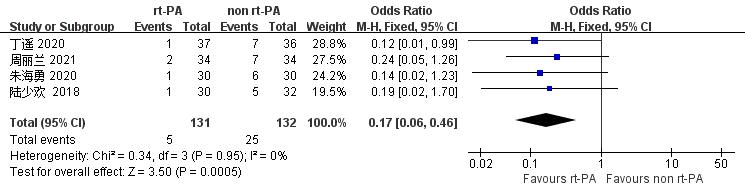 2.4.1.4 90 d脑卒中复发率共纳入4项研究,包括263例患者。Meta分析显示,静脉溶栓组90 d脑卒中复发率[OR =0.17, 95% CI(0.06, 0.46), P=0.001]低于非溶栓组,差异有统计学意义,提示rt-PA静脉溶栓治疗可降低急性MIS患者复发率,见图 6。