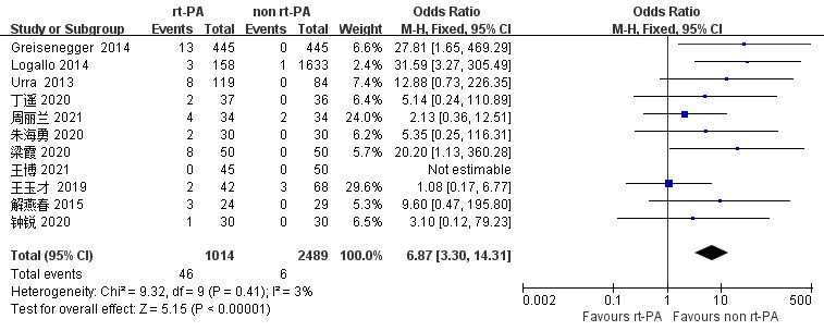 共纳入11项研究,包括3503例患者。meta分析显示,静脉溶栓组90 d ICH发生率[OR =6.87, 95% CI(3.30, 14.31), P < 0.001]是非溶栓组的6.87倍,差异有统计学意义,提示rt-PA静脉溶栓治疗可增加急性MIS患者ICH发生率,见图 7。