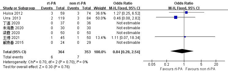 共纳入7项研究,包括717例患者。meta分析显示,静脉溶栓组与非溶栓组90 d病死率[OR =0.84, 95% CI(0.28, 2.54), P>0.05],差异无统计学意义,见图 8。