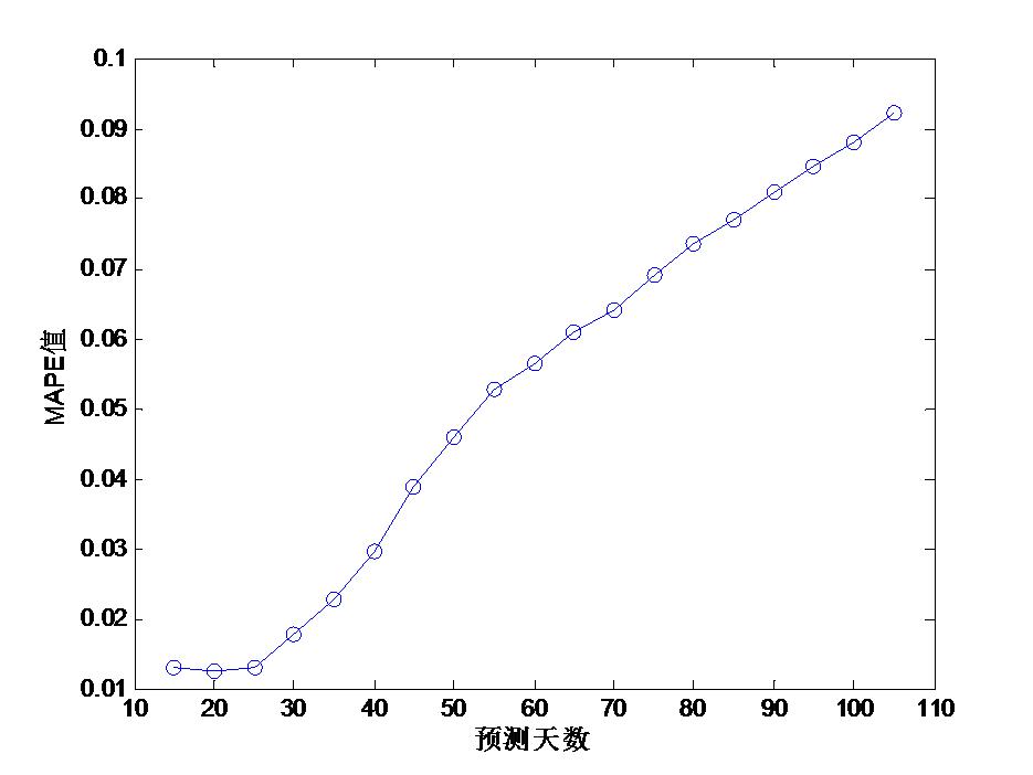 为了分析ARIMA算法预测误差,进行了更加深入的仿真实验。采用1~8月(243 d)的出车数据作为训练集,采用9~12月的数据作为测试集。分析不同的预测时长条件下,结果的MAPE变化。图 4以5 d为步长,分别预测15~105 d内的值,可以看出MAPE随着预测时长的增加而增加。图 4显示,预测拟合时长小于60 d的情况下,其MAPE小于6%。
