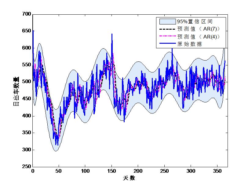 本文的研究仿真分析基于Matlab软件。ARIMA模型将全部数据按时间顺序分为训练集和测试集两部分,使用1~8月数据做训练集数据建模预测,使用9~12月数据做测试集验证模型准确度。AR模型分别使用过去7或4 d的数据预测当天的出车数量。