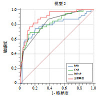 RPR、CAR、BISAP评分单独及三者联合时预测非MAP和SAP的结果均显示,三者联合时对AP病情程度的预测价值优于单一指标。见表 6、图 1和图 2。