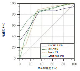 | APACHE Ⅱ评分为急性生理与慢性健康评分,BISAP评分为床旁急性胰腺炎严重度指数评分,PASS评分为胰腺炎活动性评分系统 图 1 入院时PASS评分、APACHE Ⅱ评分、Ranson评分、BISAP评分的ROC曲线 |