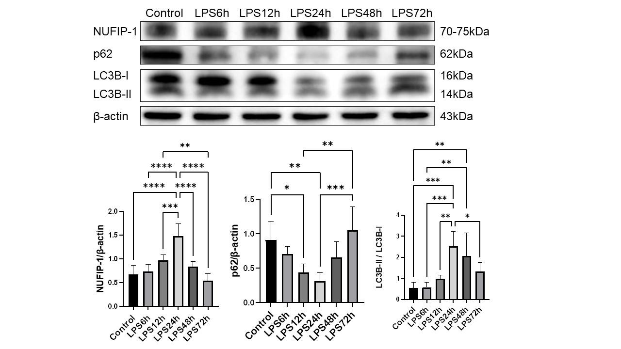 图 1 LPS刺激下DC2.4中NUFIP-1及自噬相关蛋白表达情况(n=5) Fig 1 Expressions of NUFIP-1 and autophagy-related proteins in LPS-stimulated DC2.4 (n=5) |