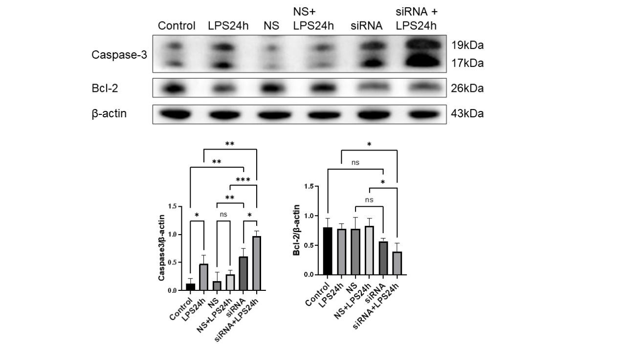 蛋白印迹结果显示,NUFIP-1 siRNA感染组相较空白对照组及空载体组在LPS刺激下DC2.4中cleaved-caspase-3表达水平显著增高[空白对照LPS 24 h组:(0.4748 ± 0.0876);空载体LPS 24 h组:(0.2849 ± 0.0418);siRNA LPS 24 h组:(0.9733 ± 0.05252),P < 0.01],而抗凋亡蛋白Bcl-2表达则明显下调[空白对照LPS 24 h组:(0.7810 ± 0.0490);空载体LPS 24 h组:(0.8292 ± 0.0729);siRNA LPS 24 h组:(0.3957 ± 0.0838),P < 0.05],见图 5。