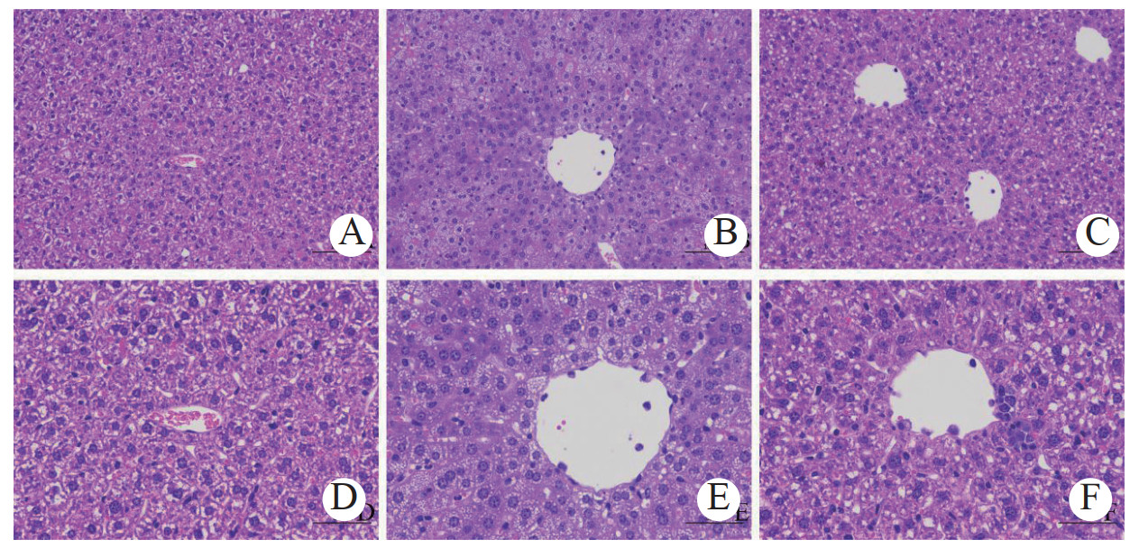 2 结果 2.1 各组小鼠病理切片HE染色结果对照组:肝组织结构(见图 1 A、D)以P < 0.05为差异有统计学意义。脓毒症组:视野中可见广泛肝细胞肿胀,胞质疏松或呈空泡状,少量肝细胞伴有空泡变性,胞质内可见微小的圆形空泡(见图 1 B、E)。脓毒症清犀角地黄汤干预组小鼠肝组织紊乱结构较前稍改善。视野中肝细胞肿胀、胞质疏松较前缓解。(见图 1C、F)