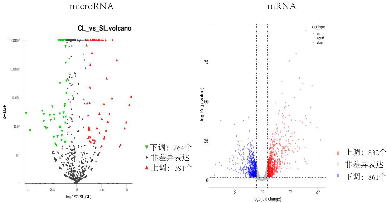 LPS干预后小鼠肝组织无论是从microRNA角度还是从mRNA角度看都出现了差异表达。其中microRNA表达上调的有391个,下调的有764个,mRNA表达上调的有832个,下调的有861个。