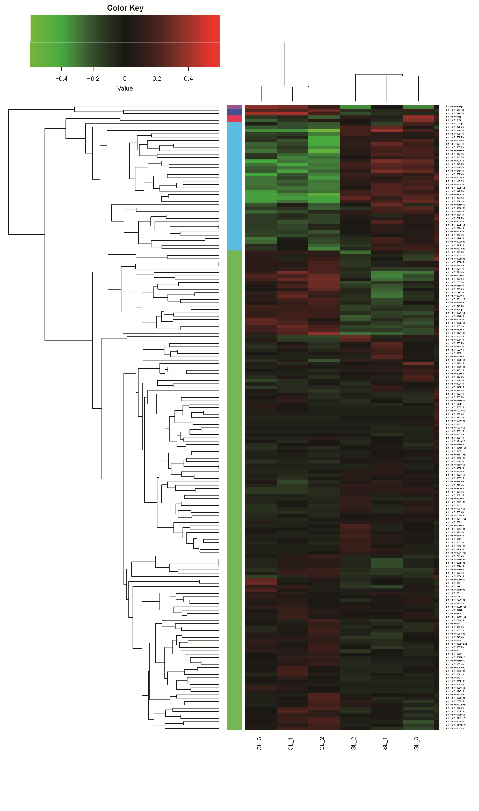 图 3 对照组,脓毒症组小鼠差异microRNA聚类情况 Fig 3 Differential microRNA clustering of mice in the control and sepsis groups |
