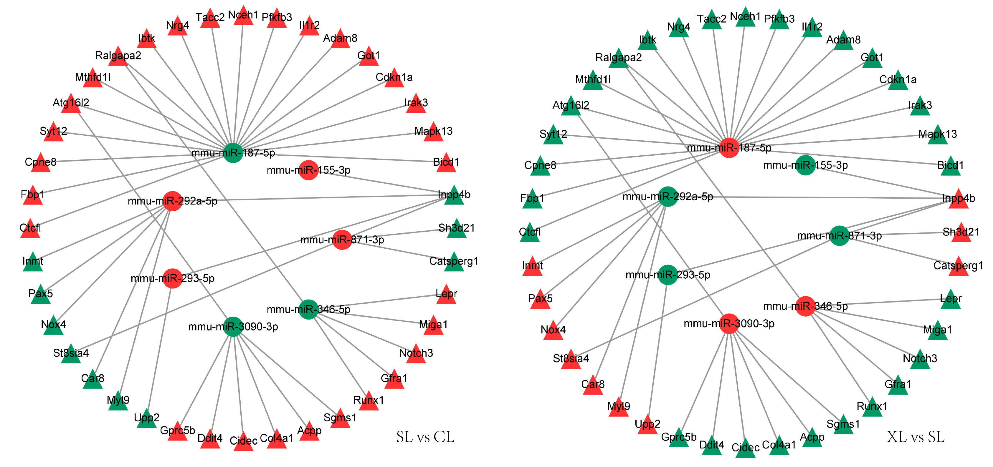 microRNA | SL组/CL组比值 | P值 | 上调下调 | XL组/SL组比值 | P值 | 上调下调 |