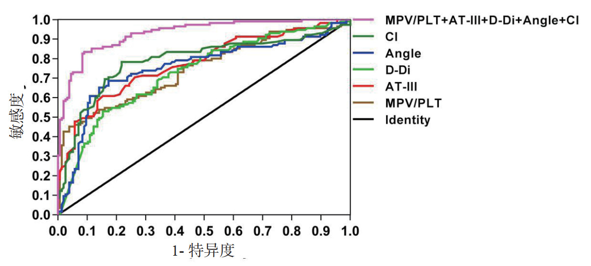 图 1 Angle、CI、AT-Ⅲ、D-Di、MPV/PLT及五指标联合检测的ROC曲线 Fig 1 ROC curve of Angle, CI, AT-Ⅲ, D-Di, MPV/PLT ratio and five indexes combined detection |
