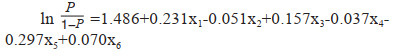 以sepsis患者28 d内是否发生死亡(是=1,否=0)为因变量,以单因素分析中有统计学意义的指标为自变量(包括APACHEⅡ评分、SOFA评分、降钙素原、乳酸、R、Angle、CI、AT-Ⅲ、D-Di、MPV/PLT),采用条件向前法建立二元Logistic回归模型。结果显示SOFA评分、Angle、CI、AT-Ⅲ、D-Di、MPV/PLT在模型中均有统计学意义(P < 0.05),其中SOFA评分、D-Di、MPV/PLT均为影响患者28 d死亡的危险因素(OR > 1,P < 0.05),Angle、CI、AT-III均为影响患者28 d死亡的保护因素(OR < 1,P < 0.05)。构建Logistic回归模型公式为: