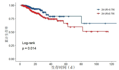 | 图 2 不同24-UR水平AP患者住院Kaplan-Meier生存曲线 Fig 2 Kaplan-Meier survival curve of AP patients with different level of 24-UR |