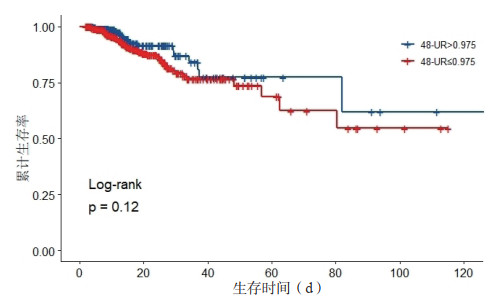 根据24-UR最佳截断点分为高24-UR组(24UR>0.795 mL/(kg·h)和低24-UR组[24UR≤0.795 mL/(kg·h)],Kaplan-Meier生存曲线分析显示,高24-UR组住院生存率高于低24-UR组,差异有统计学意义(log-rank检验:P=0.014)。根据48-UR最佳截断点分为高48-UR组[48-UR>0.975 mL/(kg·h)]和低48-UR组[48-UR≤0.975 mL/(kg·h)],Kaplan-Meier生存曲线分析显示,高48-UR组住院生存率与低48-UR组差异无统计学意义(log-rank检验:P=0.12)。见图 2,3。