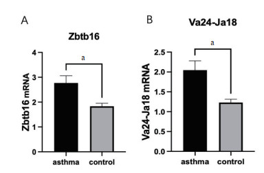 Asthma组外周血Zbtb16(编码PLZF)表达量及Va24-Ja18(iNKT特异性TCR)表达量较Control组增加,差异有统计学意义(P均 < 0.05),见图 1。
