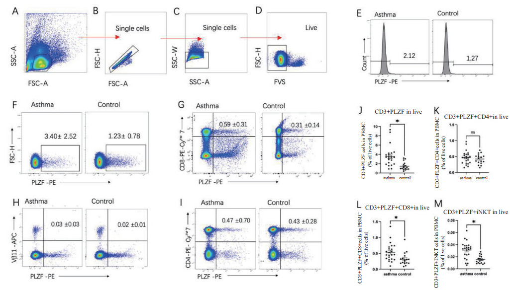 既往的研究发现PLZF参与了哮喘免疫耐受的建立。研究[7]证实ZBTB16(编码PLZF)基因在卵清白蛋白(ovalbumin,OVA)诱导的哮喘耐受小鼠肺中表达上调。通过流式细胞仪分析证实,与对照(Control)组肺相比,Asthma组小鼠肺中PLZF+细胞的数量减少;然而,与Asthma组相比,哮喘耐受组肺中PLZF+细胞的数量增加。PLZF+细胞中有相当数量的iNKT细胞,约80%的iNKT细胞在Asthma组肺中表达PLZF。且与Asthma组肺相比,哮喘耐受肺中的PLZF+iNKT细胞数量增加。此外还分析了来自Control组、Asthma组和哮喘耐受小鼠肺及肠系膜淋巴结中iNKT细胞的变化,证实了PLZF高表达的iNKT细胞通过CCL21-CCR7信号被募集到肺中,促进哮喘耐受的发展。本研究通过检测哮喘患者外周血中PLZF表达,分析各类淋巴细胞表型及功能,探讨PLZF与哮喘之间的相互关系及可能机制。
