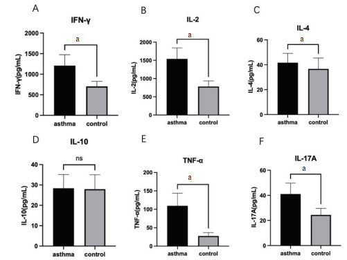 根据ELISA试剂盒说明书进行操作测定Asthma组及Control组血清中IFN-γ、IL-2、IL-4、IL-10、肿瘤坏死因子-α(tumor necrosis factor-α,TNF-α)和IL-17的含量,酶标仪检测吸光度后,通过标准曲线计算样本浓度值。