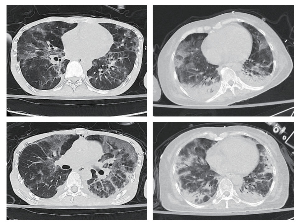 图 1 HIVn-PCP患者胸部CT:两肺多发斑片影及磨玻璃影,两下肺实变 |