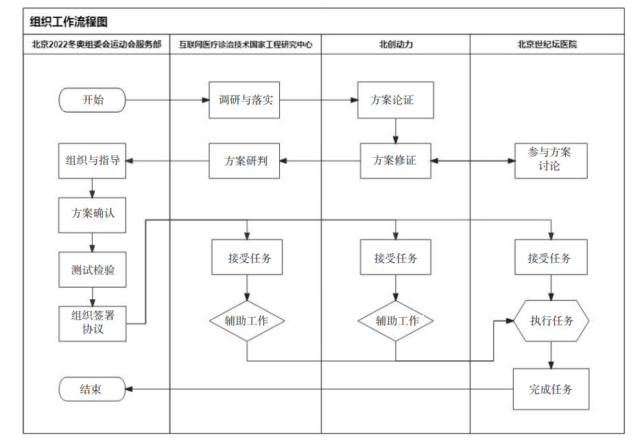 1.2 组织与管理为大型群体集会提供医疗保障是现代新兴医学学科之一,需要建立科学、高效的医疗服务体系,为参会人群提供保障[4]。北京2022年冬奥会和冬残奥会组织委员会(下称“冬奥组委”)作为承办北京2022年冬奥会和冬残奥会的组织机构,将北京2022年冬奥会和冬残奥会北京及延庆赛区的医疗保障服务工作交由北京市卫生健康委员会(下称“市卫生健康委”)负责组织和安排;市卫生健康委确定由首都医科大学附属北京世纪坛医院(下称“北京世纪坛医院”)具体承担北京2022年冬奥会和冬残奥会举办期间在五棵松体育中心冰球赛事的医疗保障服务;国家工程研究中心联合北创动力(北京)科技发展有限公司(下称“北创动力”)自愿并无偿向北京世纪坛医院提供实际赛事使用需求时间段(下称“使用期间”)的相关车载小型CT设备使用,并且负责使用期间的相关技术保障人员、运输、安装、验收、移动CT车载信息技术、维修(含零配件更换)、维护、拆除等技术保障工作。组织工作流程见图 1。