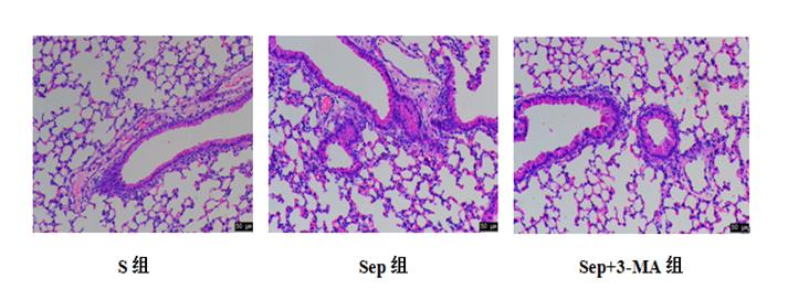 2 结果 2.1 7d生存情况S组7 d生存率为100%,Sep组7 d生存率为0%,Sep+3-MA组7 d生存率为30%。与S组比较,Sep组7 d生存率降低(P < 0.05);与Sep组比较,Sep+3-MA组7 d生存率升高(P < 0.05)。