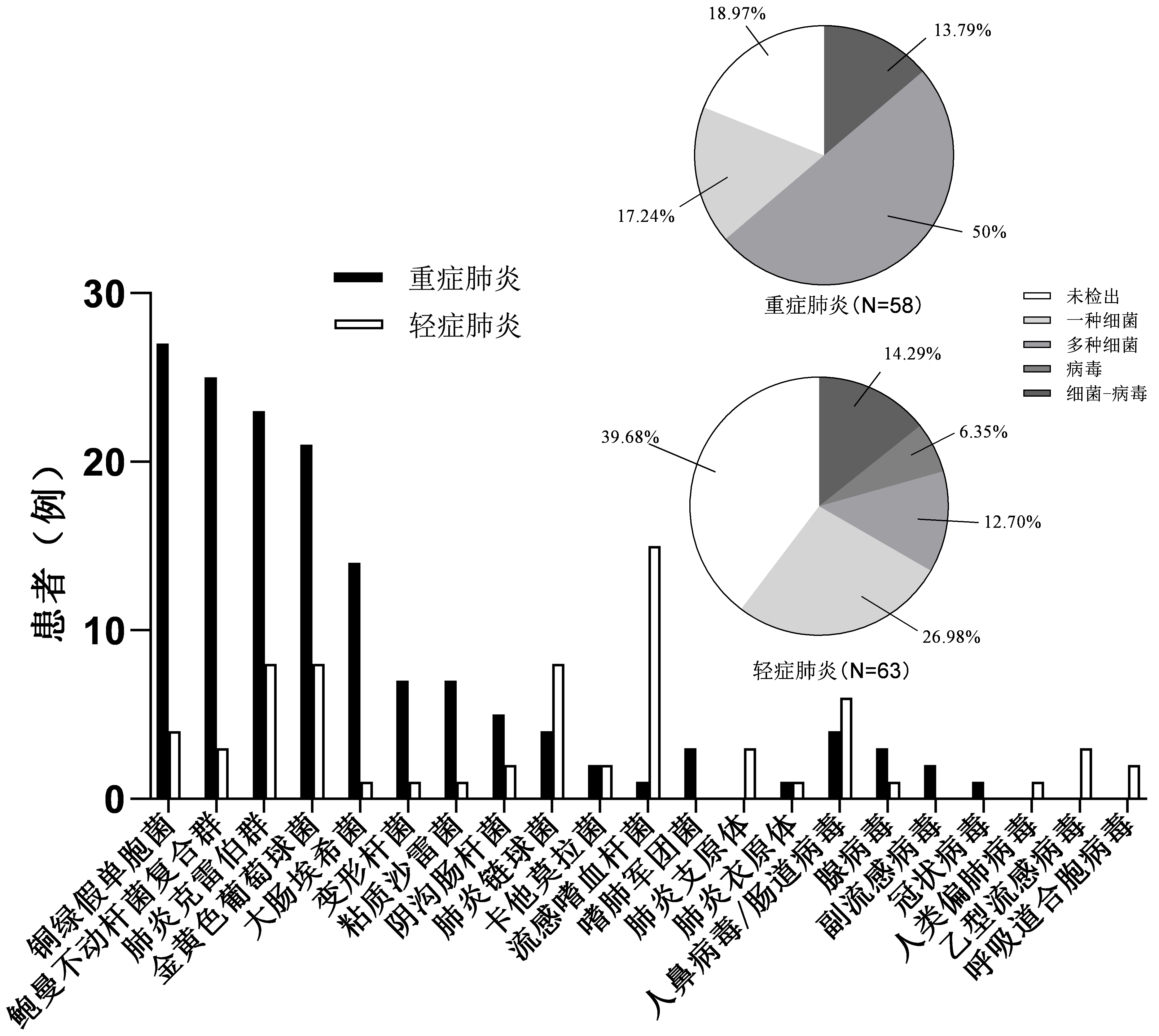 | 图 1 重症肺炎与轻症肺炎病原学检出情况 Fig 1 Pathogenic distribution of severe pneumonia and mild pneumonia |