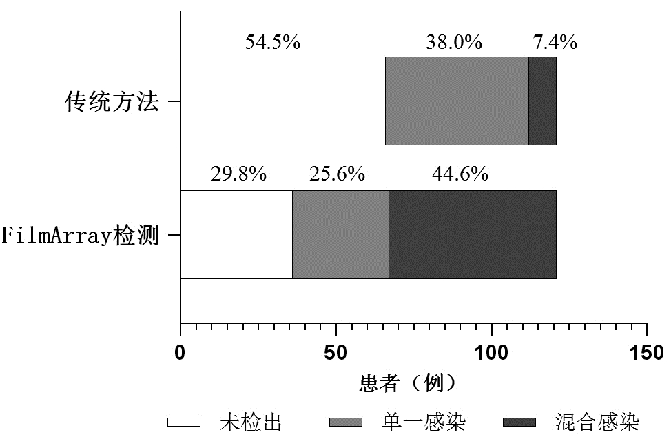 | 图 2 FilmArray检测与传统检测方法病原学构成情况 Fig 2 Pathogenic composition of FilmArray detection and traditional pathogen detection methods |