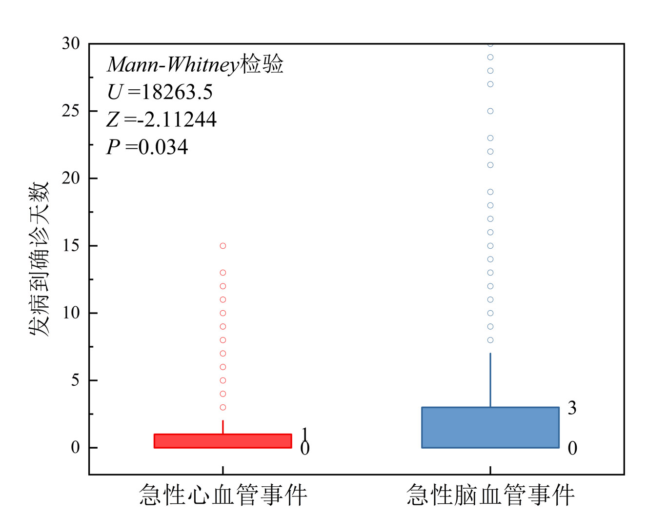 急性心血管事件从发病到确诊平均天数为0(0,1)d,急性脑血管事件从发病到确诊平均天数为0(0,3)d,急性脑血管事件从发病到确诊时间显著长于急性心血管事件(P=0.034),见图 3。
