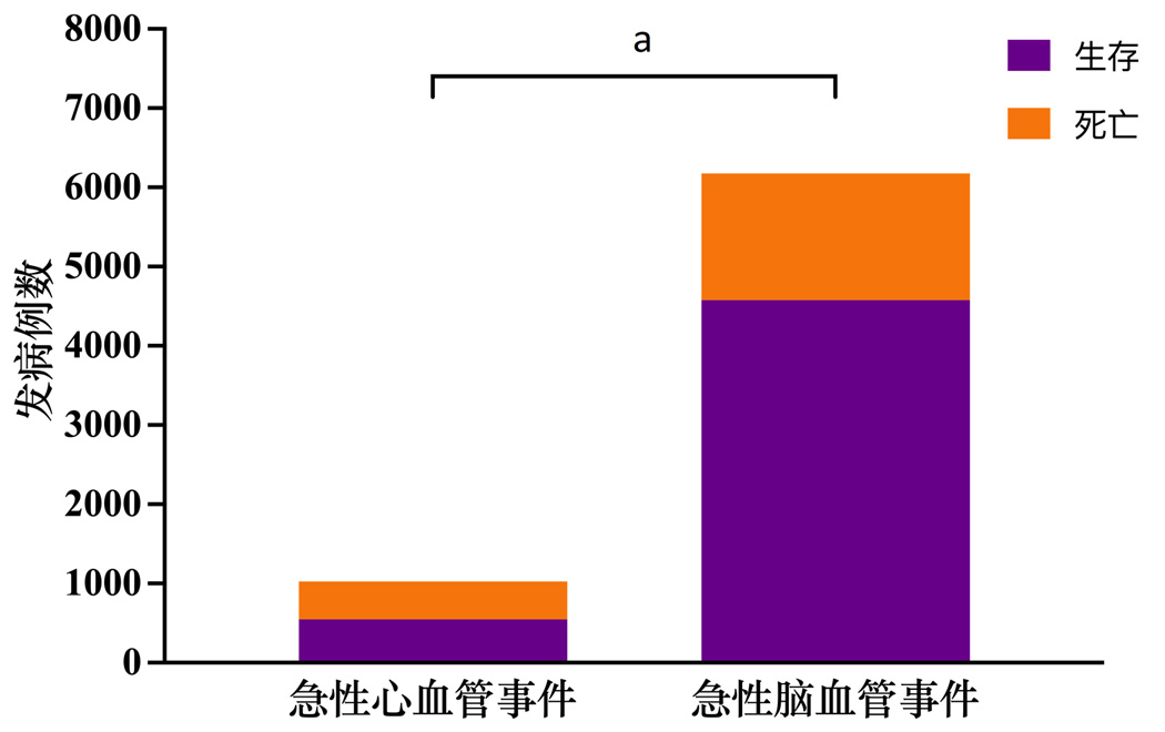 急性心血管事件死亡478例,占全部急性心血管事件(1 025例)的46.6%;急性脑血管事件死亡1 598例,占全部急性脑血管事件(6 176例)的25.9%。急性心血管事件报告死亡占比显著高于急性脑血管事件(P < 0.001),见图 4。