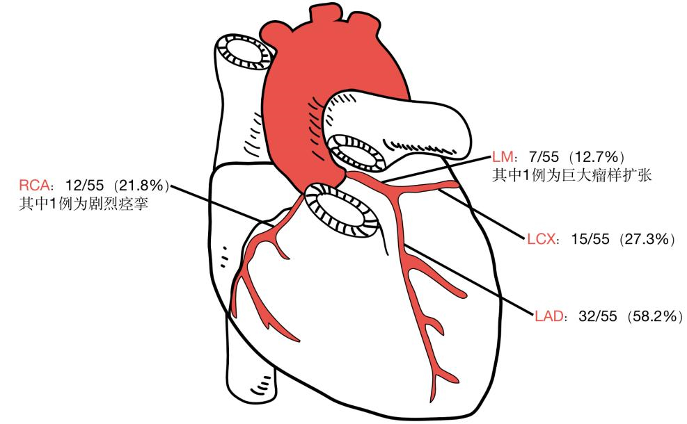 | LM为左主干,LCX为左回旋支,LAD为左前降支,RCA为右冠状动脉 图 1 55例行冠脉造影检查结果 Fig 1 Coronary angiography in 55 patients |