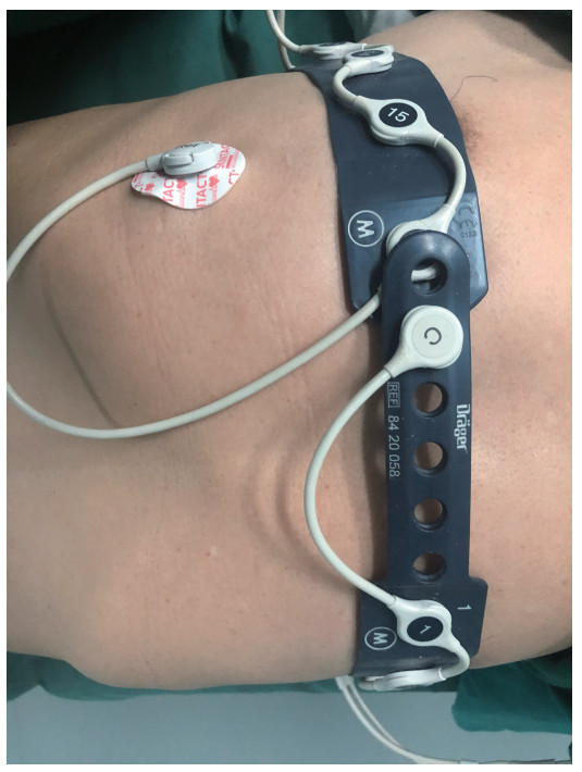 1.2 观察指标患者急诊入手术室后常规吸氧,监测心电图(ECG)及SpO2,局麻下桡动脉穿刺置管监测有创动脉压(ABP)。实施电阻抗断层成像监测(PV500型,Dräger Medical,Germany)四个区域ROI 1、ROI 2、ROI 3及ROI 4,ROI(Lung Region of Interest)即(肺区域通气容积÷总通气容积)×100%,四个区域总和为100%,16个电极片围绕胸廓第四肋水平安装,见图 1。