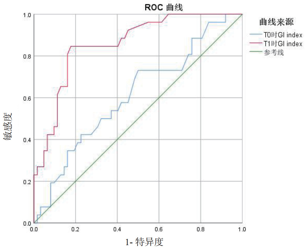 | 图 4 T0和T1时GI指数对术后7 d肺部感染预测的ROC曲线 Fig 4 ROC curve of GI index at T0 and T1 in predicting pulmonary infection within the 7 days after operation |
