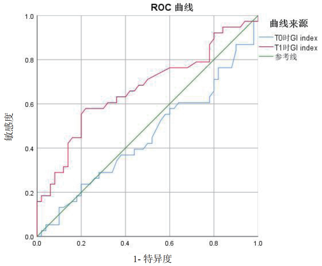 1.3 统计学方法采用SPSS 25.0软件进行分析,正态分布的计量资料以均数±标准差(x±s)表示,两组间比较采用独立样本t检验;计数资料比较采用χ2检验或Fisher精确检验。偏态分布计量资料以中位数(四分位间距)[M(Q1, Q3)]表示,组间比较采用秩和检验。采用受试者工作曲线(ROC曲线)评价T0和T1时GI指数对肺部感染发生的预测价值,P < 0.05为差异有统计学意义。