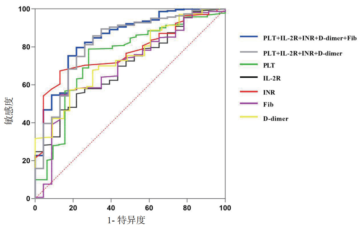 | 图 1 通过联合凝血和炎症指标用ROC曲线预测pre-DIC状态 Fig 1 Combination of coagulation and inflammatory biomarkers to predict the pre-DIC state by ROC curves |