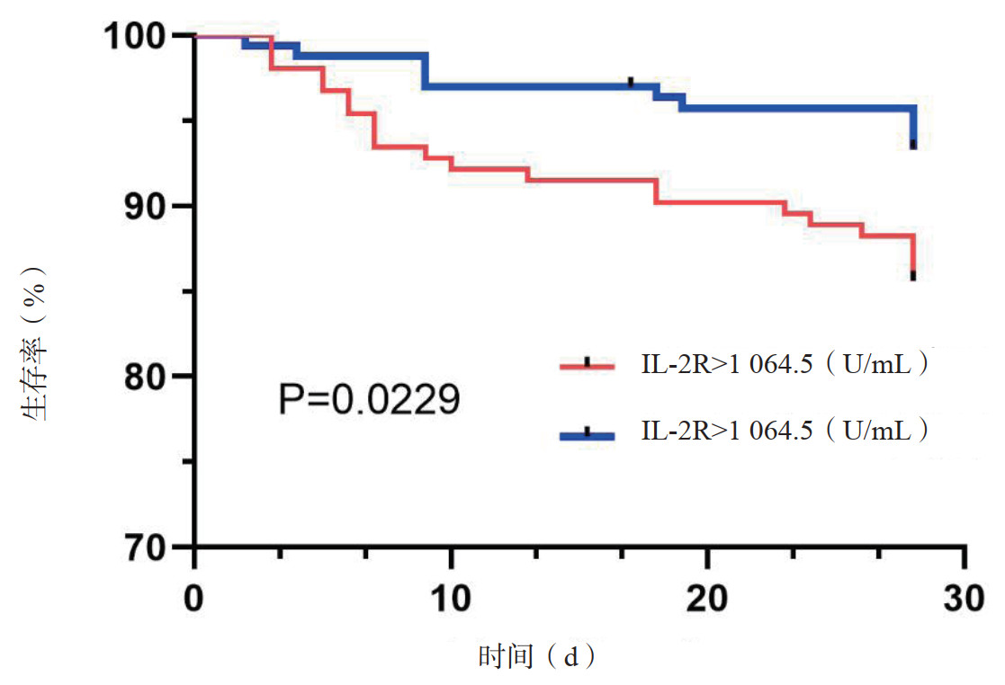 通过ROC曲线计算IL-2R预测脓毒症患者28 d病死率的最佳截断值,以最佳截断值将IL-2R分为高水平组和低水平组,分别绘制两组的Kaplan-Meier生存曲线并进行log-rank检验发现,脓毒症患者IL-2R低水平组(IL-2R ≤ 1 064.5 U/mL)与高水平组(IL-2R > 1064.5 U/mL)的28 d病死率具差异有统计学意义(P < 0.05,图 2)。