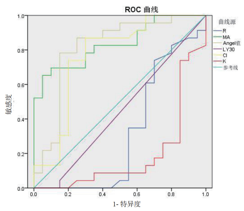 本研究构建ROC曲线分析,得到不同截断水平的CI、MA、Angel的预测指数在脓毒性休克患儿发生DIC中诊断的敏感性和特异度,见图 1。约登指数最大0.602时,MA对应的诊断点为57.35 mm,预测脓毒性休克发生DIC的敏感性65.2%,特异度95%(AUC=0.837,95%CI: 0.702~0.946);约登指数最大0.57,CI对应的诊断点为-4.7,预测脓毒性休克发生DIC的敏感性87%,特异度70%(AUC=0.766,95%CI: 0.613~0.920);约登指数最大0.6339,Angel值对应的诊断点为51.75°,预测脓毒性休克发生DIC的敏感性78.3%,特异度85%(AUC=0.815,95%CI: 0.675~0.955);曲线下面积大于0.7,说明CI、MA、Angel对预测脓毒性休克发生DIC的诊断有意义,即其预测DIC的最佳临界值MA < 57.35 mm、Angel < 51.75°、CI < -4.7;其中MA预测能力最强。