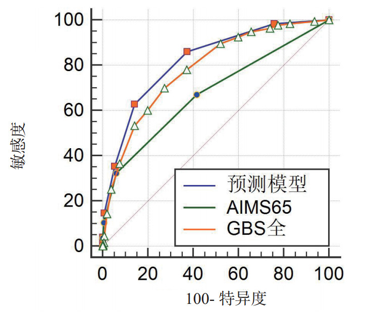 | 图 1 预测模型与GBS, AIMS65的ROC曲线 Fig 1 ROC curve of the predictive model, GBS and AIMS65 |