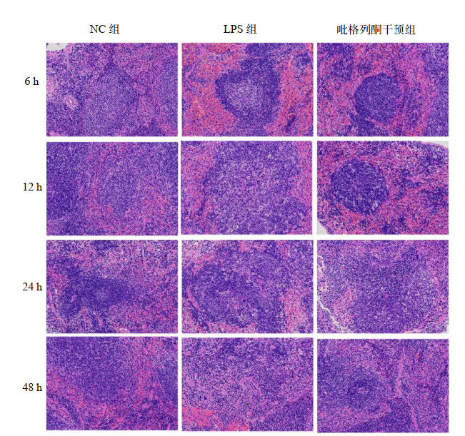 光镜下观察,NC组脾脏红白髓之间界限清晰,红髓内含有丰富的红细胞,脾窦间隙大小均匀,未见扩张,脾小结形态为形态规则的椭圆形,小淋巴细胞排列紧密,未见炎症、坏死等病理性改变。LPS组制模后6 h可见部分脾小结内小淋巴细胞数量减少,细胞排列疏松,红髓内部分脾窦间隙轻度扩张; 12 h后脾小结内大量细胞坏死,可见坏死的细胞碎片,脾小结内细胞排列疏松,脾小结结构散乱; 24 h后脾小结内细胞坏死进一步加重,局部红髓内可见炎性细胞弥散性浸润; 48 h后脾小结结构极度散乱,脾小结内小淋巴细胞大量消失,细胞排列疏松,红白髓之间界限模糊,伴有炎性细胞弥散性浸润。吡格列酮干预组制模后6 h、12 h、24 h、48 h细胞坏死程度及炎性细胞浸润较LPS组减轻。见图 1。