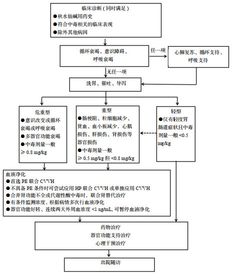 4 秋水仙碱中毒的治疗秋水仙碱中毒无特效解毒剂。治疗遵循中毒救治原则,包括减少毒物吸收、促进毒物排出、药物应用和器官功能支持治疗。急性秋水仙碱中毒救治流程图见图 1。