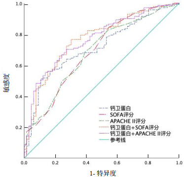 图 1 钙卫蛋白、APACHE Ⅱ评分、SOFA评分及联合变量预测脓毒症患者发生AKI的ROC曲线 Fig 1 ROC curve of calprotectin, APACHE Ⅱ score, SOFA score and their combinations for predicting AKI in patients with sepsis |