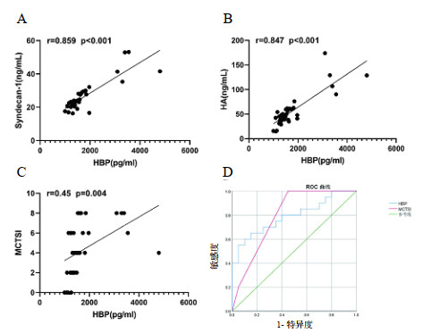 A: HBP与Syndecan-1相关性分析结果;B: HBP与HA相关性分析结果;C: HBP与MCTSI相关性分析结果;D: HBP及MCTSI预测AP严重程度的ROC曲线 图 1 相关性分析结果及ROC曲线 Fig 1 The results of correlation analysis and ROC curve |