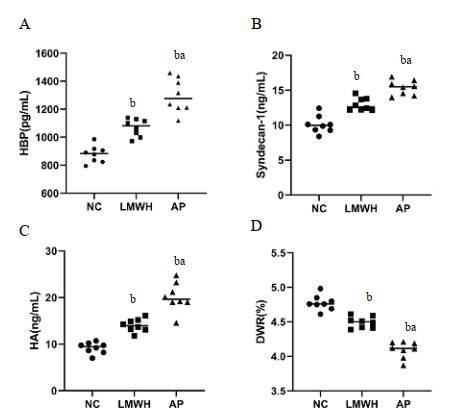 大鼠动物模型中HBP、Syndecan-1、HA及DWR在多组间比较结果,其中与NSAP比较,aP < 0.05,与NC组比较, bP < 0.05 图 2 动物模型中HBP、Syndecan-1、HA及DWR检测结果 Fig 2 The results of HBP、Syndecan-1、HA and DWR in animal models |